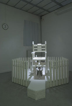 Ryan Parteka's installation evokes the interior of a cell. From behind the bars, a red fluid is mechanically pumped in, and then out again, in rhythmic movements. The white, chalk-like ropes or shackles, consisting of the binding agents that are used in medicines, are scattered around the floor. The space is filled with a crackling, organic but lifeless, electronic sound. The neon letters, filled with red fluid, that form the word 'Castigatio', seem intended to name the whole - to embrace it.