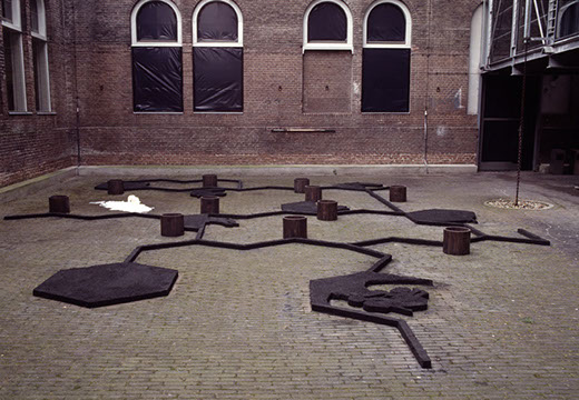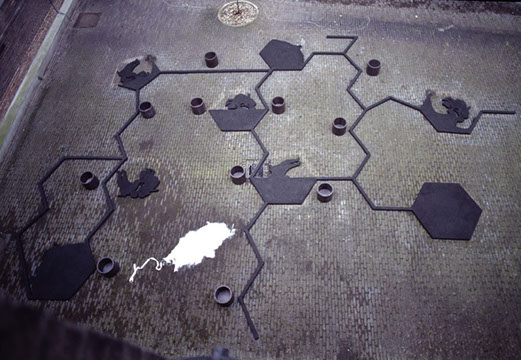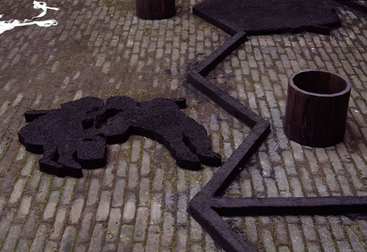 For his exhibition at Galerie Fons Welters, Ryan Parteka drew inspiration from a famous chapter in Amsterdam's history. During one of his forays into old documents, he stumbled on an account of the old Rasphuis on Heiligeweg, written by a Portuguese traveller. The writer relates that this house of correction, established in the sixteenth century, possessed a 'drowning cell'. Prisoners would be confined to the cell while it was slowly filled with water. Their only salvation lay in pumping out the water. According to this particular source, pumping would only delay death; the prisoners died of exhaustion anyway. The old gate of the house of correction with the word 'Castigatio' and the personification of the city of Amsterdam brandishing a whip, flanked by two manacled men, can still be seen on Heiligeweg.