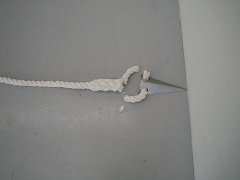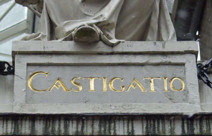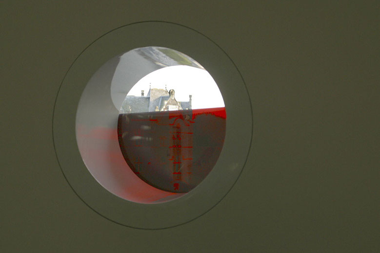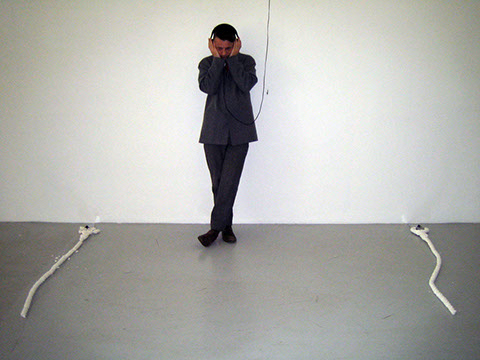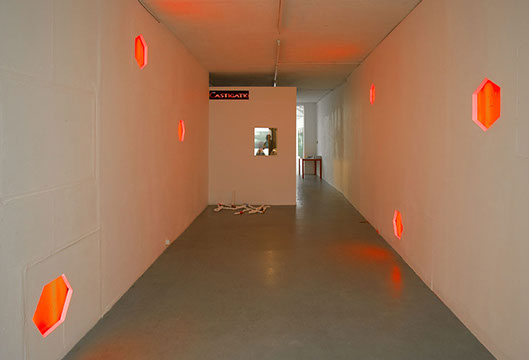 It is as if we have arrived in purgatory: a space in between life, death, heaven and hell, a place of penance, where sins are washed away, after which the gates of heaven will open for us. The association is evoked by the bars surrounding the gallery's anteroom, the buzzing sounds, the red fluid behind the bars, the ropes on the floor, and the prominently displayed word 'Castigatio' (penance).