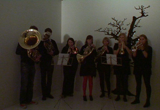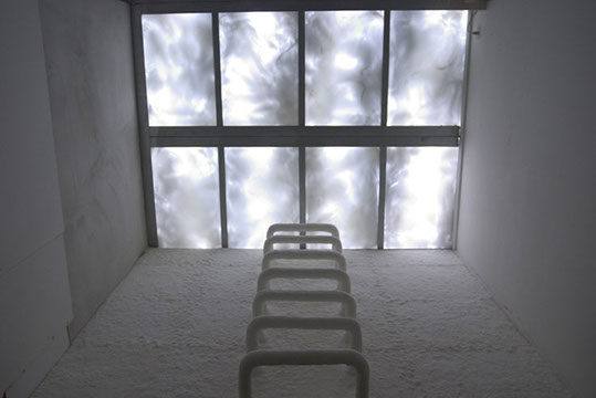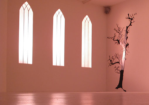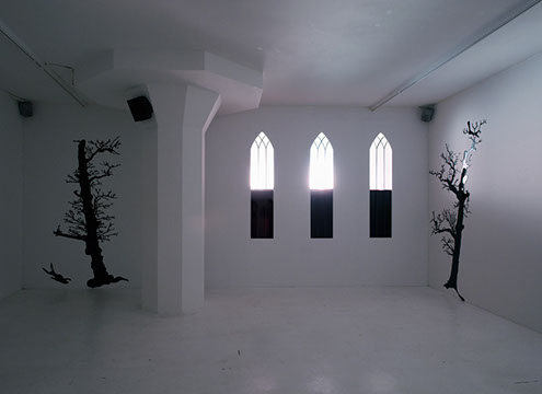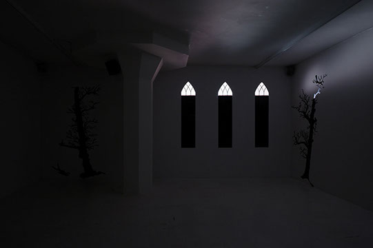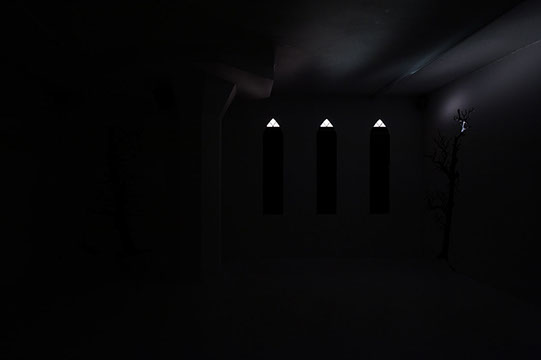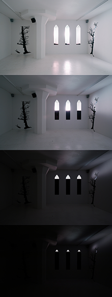 For Each Thousand Years, But a Day the space and time elements intertwine past, present and future. The installation is controlled by a computed prediction of light and darkness for Reykjavik in the next 1000 years. Blood fills and drains from three arched window panes, which is pumped through devices pulsing in tandem with the rising and setting of a simulated sun. While light floods into the space and remains for different lengths of time, darkness swallows up the room with equal disposition. Along the ceremonious beginning and ending of the simulated days, an electric guitar and a group of brass instruments solemnly bring a tempo to the rite.